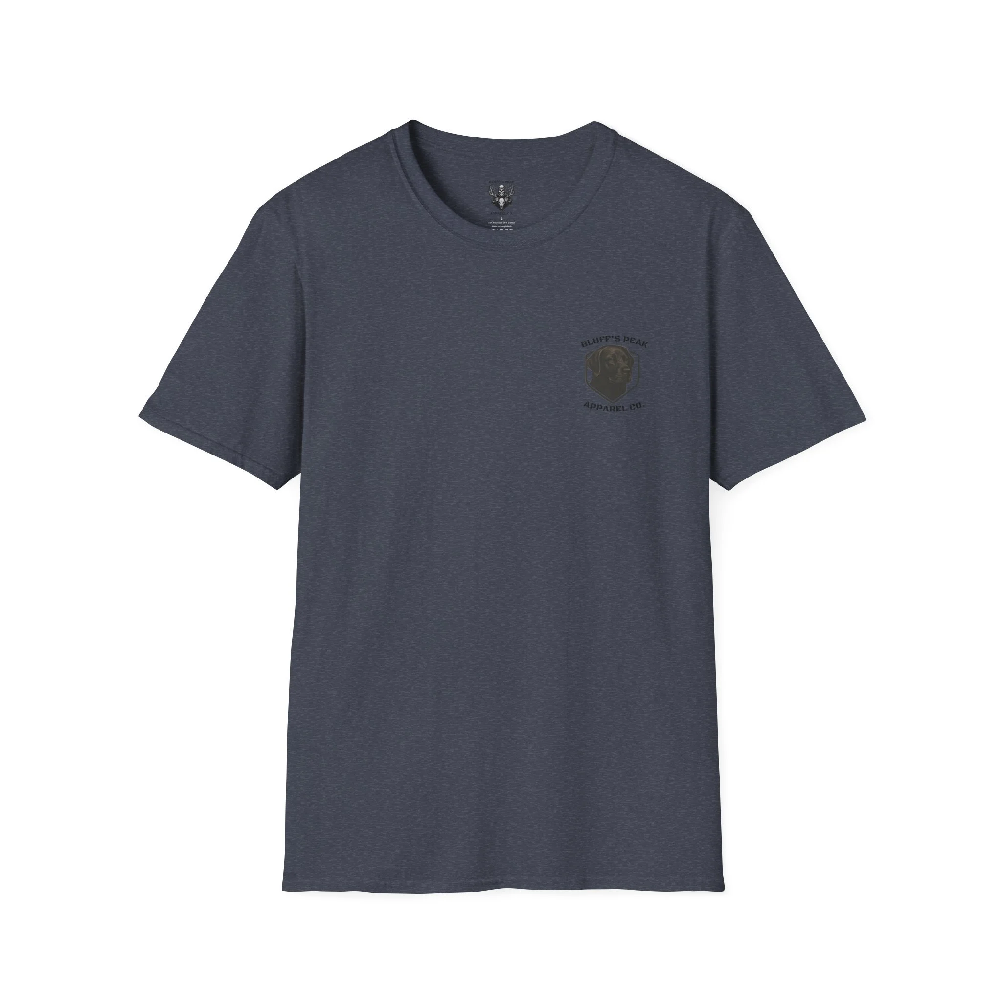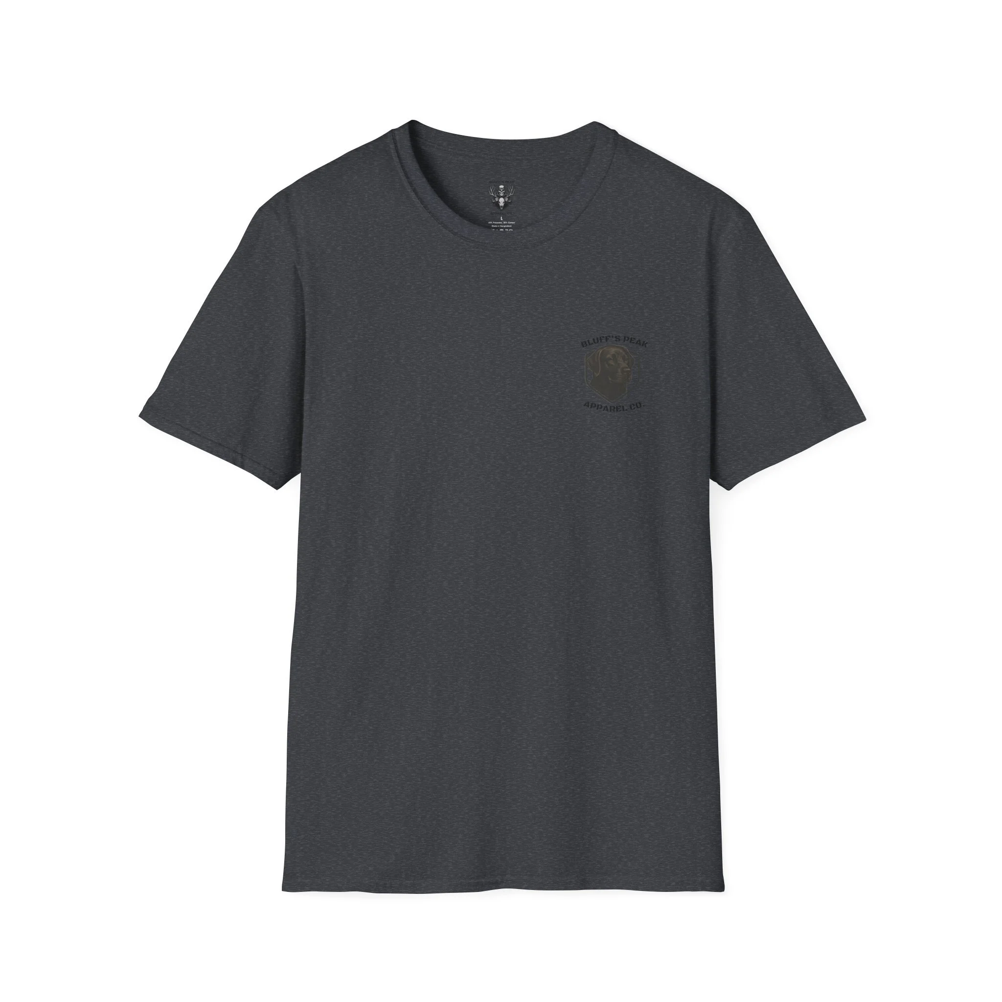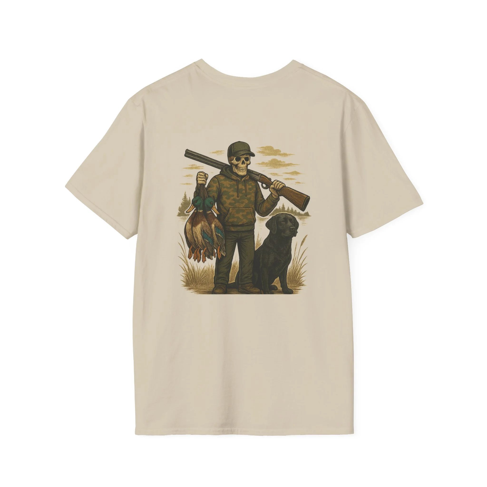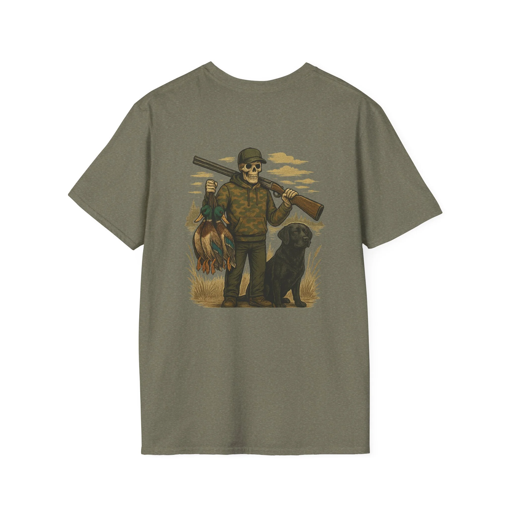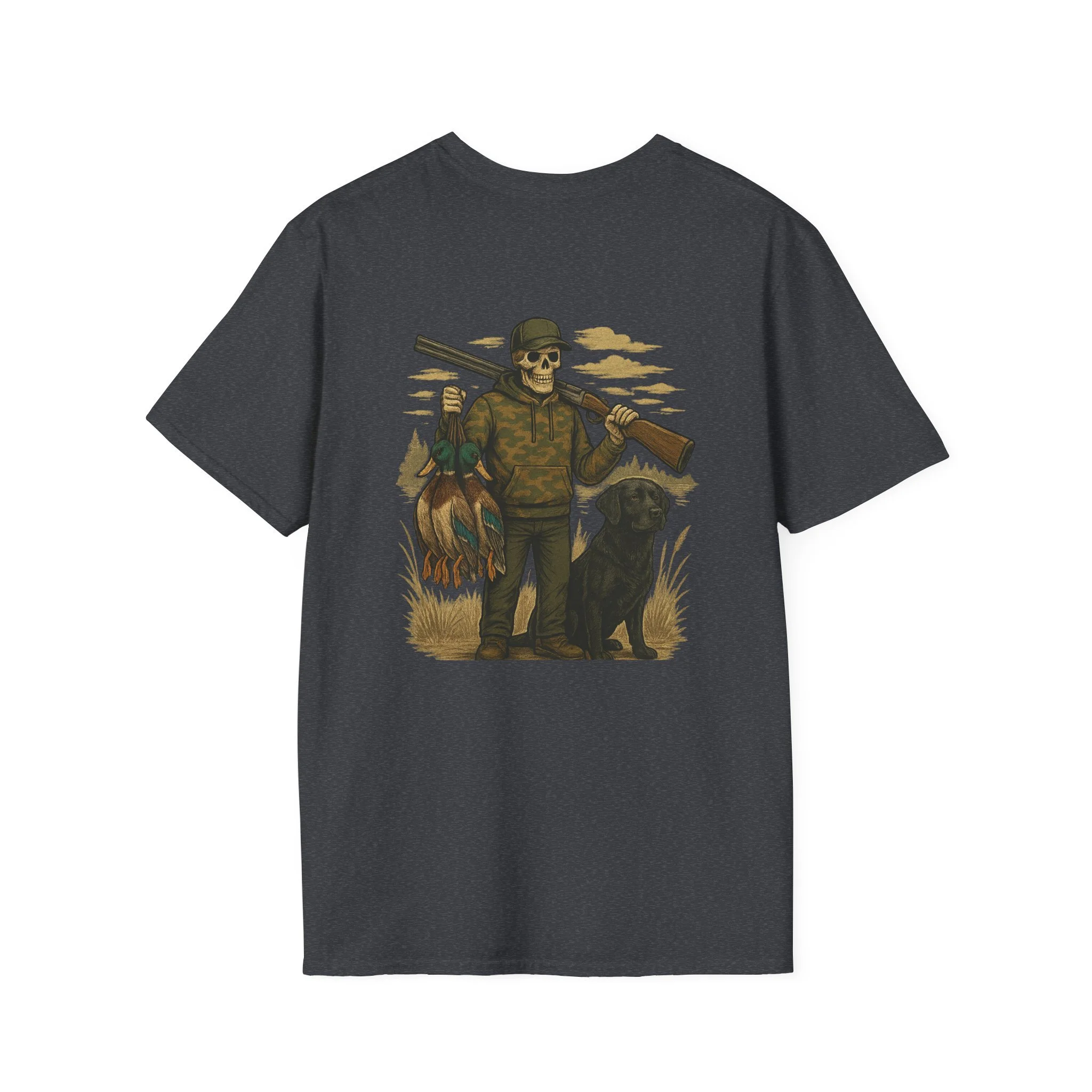 This T-shirt features our Grip n Grin Duck design which features a full back print of a skeleton duck hunter and a front print of a bird dog.